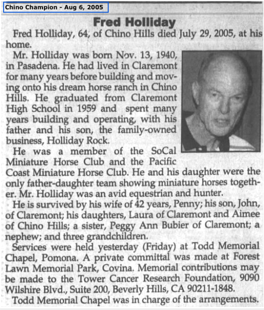 Fred Holliday died July 29, 2005, at his home in Chino Hills at the age of 64. Fred was born in Pasadena on November 13, 1940, and had resided in Claremont for many years prior to building and moving into his dream horse ranch in Chino Hills. He had graduated from Claremont High School in 1959 and then spent many years building and operating, along with his father and his son, the family owned business, Holliday Rock.